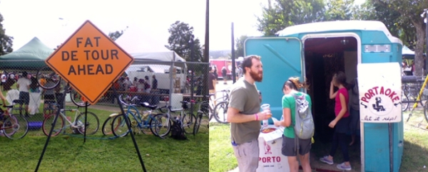 This sign confused me.The words in Tour de Fat have been switched around into Fat de Tour. At first I thought it was a mistake, but then I realized that it's a pun (a joke with words.) Can you figure out what the pun is? The name Tour de Fat is a parody of a famous bicycling event. Do you know what it is? What do you think the word portaoke means? From what other words does it come? What language would you say that it is? What do you think the people inside the booth are doing?