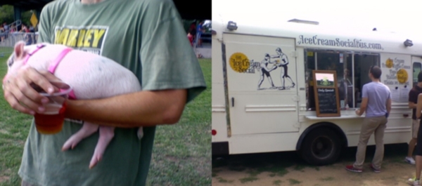 (left picture) This man brought his pet. (right picture) What's an "ice cream social"? In this phrase, what part of speech is the word social? Why is the picture on the truck ironic?