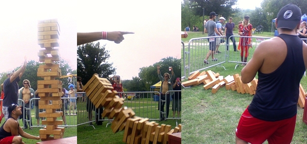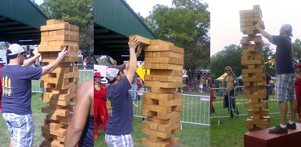 My Favorite Part Out of all the things I saw, I liked this game the best. Here's how it works: Each player removes a block from the stack and places it on the top. Then the next player does the same. The stack keeps getting higher and higher. and higher.